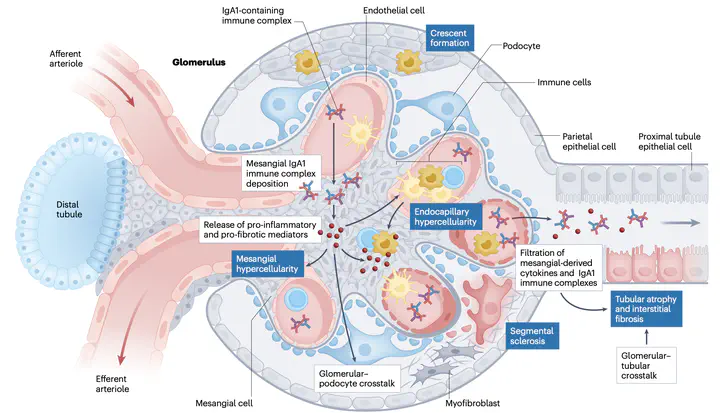 IgA腎病變(IgA nephropathy, IgAN)是一種常見的原發性腎絲球腎炎,雖然進程緩慢,但仍有不少患者在會一生中面臨腎衰竭或是洗腎的風險。該疾病的致病機轉主要來自於黏膜免疫系統中衍生的缺半乳糖化IgA1在血液中濃度升高,且和特異性IgG和IgA抗體結合,形成免疫複合物沉積於腎小球內,導致發炎、補體活化及腎損傷。儘管現有的治療選擇有限,但不同類型的療法正在快速發展,本篇針對最新發表在nature review nephrology的文章,深入探討IgAN的病生理機制與治療前景。