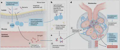 IgAN患者的病理性Gd-IgA1主要以高分子量免疫複合物形式存在,這些複合物由抗Gd-IgA1的IgG或IgA抗體結合而成,其形成與遺傳因素(如HLA多型性)和環境因素密切相關。在環境因素的部分,微生物可能會在細胞表面的多醣體表現GalNAc motif,而B細胞會因此被激活而分泌對抗這個motif的IgA與IgG,並會直接和裸露出來的鉸鏈區域結合,與Gd-IgA1形成複合物。